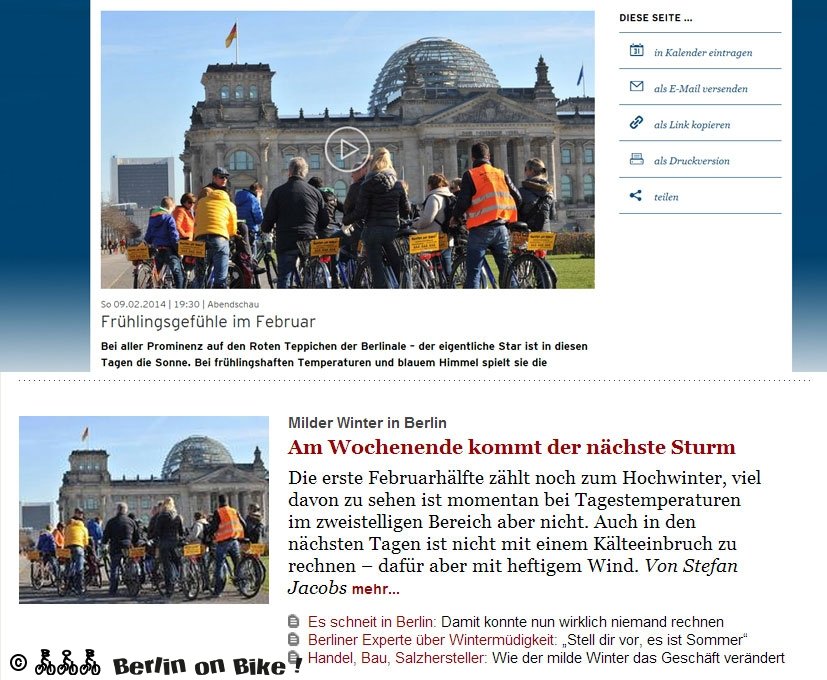In den letzten Tagen haben sich für uns gleich zwei Erkenntnisse ergeben. 1. Es zahlt sich richtig aus, wenn die dpa Bilder macht und die dann verteilt. 2. Radfahrer im Sonnenschein mit Reichstag im Hintergrund eignen sich prima, um Artikel/Beiträge mit Wetterbezug zu bebildern. Nennt sich dann Atmo und ist völlig unabhängig vom beschriebenen Wetter.