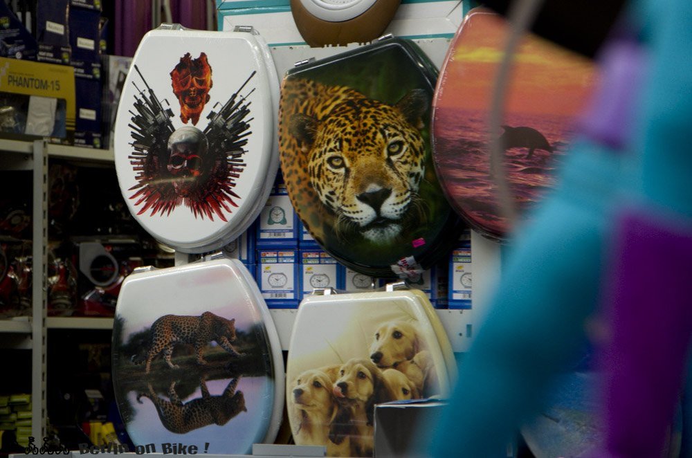 Alles extrem bunt hier, extrem aus Plastik und extrem unterhaltsam dazu wirklich ungemütliches Licht und Ladenbesitzer, die uns und unsere Kameras mißtrauisch beäugten. Noch mal aufregend wird es in den Lebensmittel-Geschäften. Man kann sich hier gut und gerne ein paar Stunden durch die Auslagen wühlen und sich dabei immer wieder schauernd fragen: Ob es wohl Leute gibt, die so was ernsthaft schön finden? Klodeckel mit dem Logo von The Expendables (gefaked), Winkekatzen und Gummitiere in allen Größen und Formen (echt), Bunte Nägel (Fake) und schlechte Tattoos (echt und fake, ganz nach Wunsch).