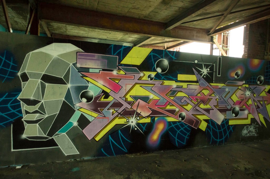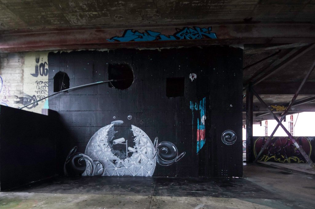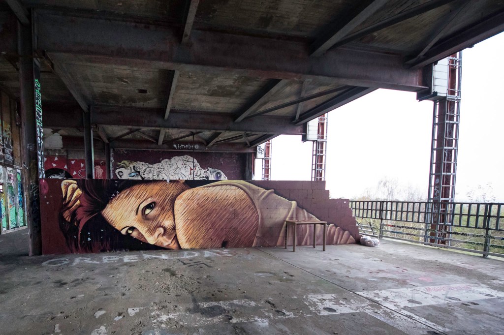 Amidst the decaying structure every surface is painted. There is so much art, that it’s hard to properly take in all of it. From tiny stencil to giant murals. From completely unknown newbies to stars of the international street art scene, they are all here; El Bocho, Elfkunst, Obey, Tobo, Plotbot Ken (with a whole series of post-apocalyptic characters) and many more we haven’t even identified yet.